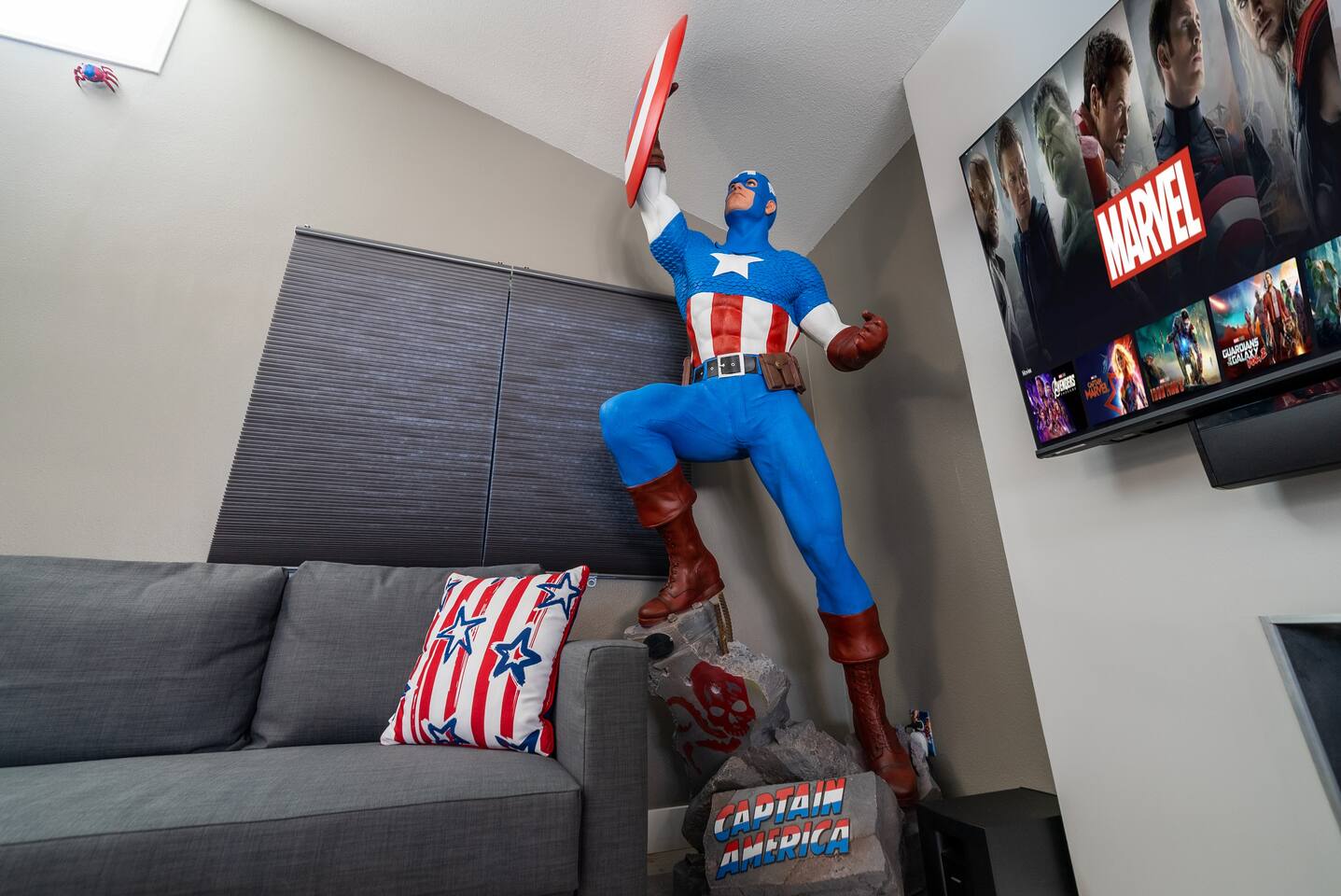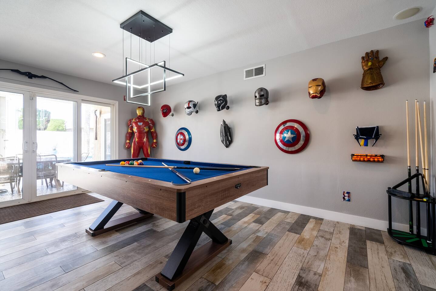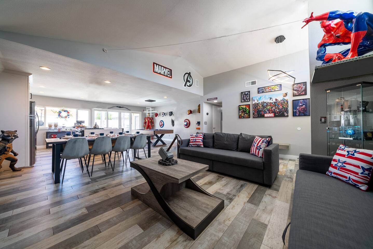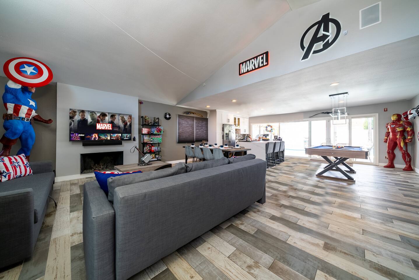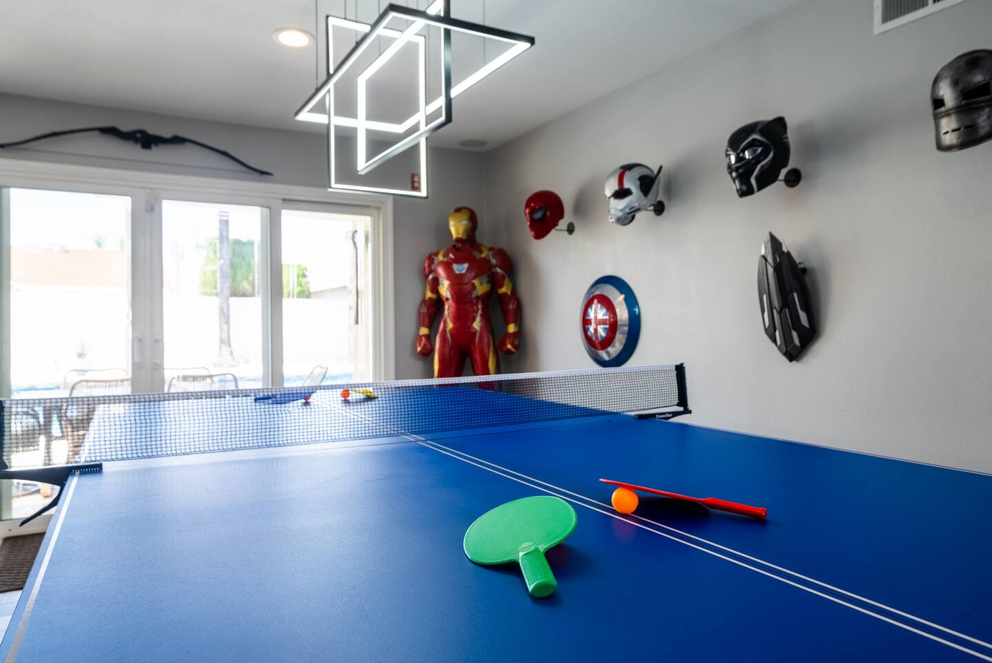 ๐ฆธโโ๏ธ Welcome to the Avengersโ Headquarters! ๐ Suit up, heroesโitโs time to step inside the ultimate superhero hideout! Whether youโre here to train, strategize, or just unwind after saving the world, this Marvel-themed retreat is packed with legendary amenities to help you recharge and assemble for your next mission. From the life-sized hero statues to Tony Starkโs private garage-turned-movie theater, every corner is designed to immerse you in the Marvel Universe! ๐ฅโจ Your journey begins in the living room command center, where youโll find heroic memorabilia from some of the greatest battles ever fought, and leads to a high-tech kitchen perfect for cooking up a feast fit for a team of superheroes. Choose from three epic sleeping quarters, each inspired by a Marvel legend, to rest and refuel. Outside, unwind in the heated pool or plan your next operation in the fully equipped backyard base. But the most important mission awaits! ๐ฆนโโ๏ธ Take part in the Avengers Scavenger Hunt and help Earthโs Mightiest Heroes defeat Thanos and save the world! ๐๐ Complete challenges, find hidden clues, and secure the Infinity Stones before itโs too late! โก Avengers, Assemble! ๐ฆธโโ๏ธ โ LIVING ROOM/GAME ROOM โ ๐๏ธ๐ฎ Gather in the living room and make memorable moments with your family, under the watchful eyes of Iron Man, Rocket, Captain America, and Spider-Man! ๐ฆธ Play classic board games ๐ฒ, challenge your team on the Xbox ๐ฎ, or compete in a game of pool or ping-pong! ๐ ๐๏ธ Two Super-Comfy Sofa-Beds for your entire team ๐บ Smart TV with Netflix, Disney+, HBO, Hulu & more streaming options ๐ฎ Xbox One Console with a full roster of video games ๐ฒ Classic Board Gamesโperfect for some low-stakes fun ๐ฑ Pool/Ping-Pong Table Combo for heroic challenges โ THE AVENGERS GALLEY โ KITCHEN & DINING โ ๐ฝ๏ธ๐ฟ Channel your inner Tony Stark and whip up meals in the fully equipped kitchen! With spacious countertops and a central kitchen bar, itโs easy to prepare a feast for your team. ๐ซ Serve up heroic dishes at the dining table with Rocket Raccoon standing by! ๐ ๐ณ High-Tech Appliances: Microwave, Oven, Stove, Refrigerator โ Coffee Station with Complimentary Coffee & Tea ๐ฟ Popcorn Popper for Movie Nights ๐ฝ๏ธ Full Set of Hero-Worthy Cookware & Utensils Feast with the Avengers: ๐ด Dining Table for 8 heroes ๐ฝ๏ธ Kitchen Bar Seating for 4 recruits ๐ฅฃ Complimentary Breakfast Cereal & Snack Basketโperfect for late-night missions โ SUPERHERO QUARTERS โ 3 BEDROOMS โ ๐๏ธ๐ฅ Retreat to one of the three themed quarters, each dedicated to an Avengerโs legacy! Whether itโs planning your next move from Tony Starkโs workspace or bunking with Spider-Man on his next mission, youโll find everything you need to recharge for your next battle. ๐ก๏ธ ๐ Bedroom 1: The Stark Suite - King-Size Bed + Workspace for strategizing with Tony - Ensuite Bathroom + 4K Smart TV for late-night intel - Stark-approved decor and tech ๐ Bedroom 2: The Guardiansโ Hideout - Queen-Size Bed with Guardians of the Galaxy theme - 4K Smart TV for movie marathons - A galactic haven to escape Ronanโs wrath ๐ท๏ธ Bedroom 3: Spideyโs Bunk - Bunk Bed (Twin/Twin) + Trundle for extra recruits - Toddler Bed for junior superheroes-in-training - Spider-Man theme and secret desk ๐ค Premium Linens, Super-Soft Pillows, and Heroic Decor in every room ๐บ Smart TVs in each bedroom to keep up with mission reports โ TONY STARKโS GARAGE: MOVIE THEATER & ARCADE โ ๐ฌ๐ฎ Step into Tony Starkโs private garageโthe ultimate high-tech lab and movie theater! Here, Tony has transformed his workshop into a heroic movie marathon venue featuring three rows of theater seating ๐ฟ and a massive widescreen. Between shows, take on the free-to-play arcade machines ๐น๏ธ or get an up-close look at the Mark XLII armor on display! โ๏ธ๐ฅ ๐ฅ HD Projector & Widescreen with Netflix, Disney+, HBO, Hulu & 100+ Channels ๐๏ธ Theater Seating for 10 Recruits ๐น๏ธ 7 Free-to-Play Arcade Machines ๐ก Avengers Mission: Join the scavenger hunt ๐บ๏ธ and help the Avengers stop Thanos! Look for clues hidden in Tonyโs lab and around the HQ to collect all six Infinity Stones and save the universe! ๐ฅ๐ โ THE AVENGERS TRAINING GROUNDS โ BACKYARD โ ๐โโ๏ธ๐ฅ After a day of defending the galaxy, kick back in the fully fenced backyard base. Unwind in the heated pool ๐ฆ, challenge your team to poolside basketball, or kick back in the lounge area under the sun parasols. This fully fenced backyard offers everything for a heroic day of relaxation! ๐ ๐โโ๏ธ Heated Swimming Pool with Waterfall Feature ๐ Poolside Basketball Hoop for some friendly competition ๐๏ธ Lounge Seating with Parasols for extra comfort ๐ฆ Fun Pool Toys for heroic splashes ๐ฝ๏ธ BBQ Grill for grilling up your next team feast ๐ด Outdoor Dining Table for 6 recruits Ready to live like an Avenger and save the universe? ๐ฅ Book now and make this home your superhero HQ! ๐ฆธโโ๏ธ๐