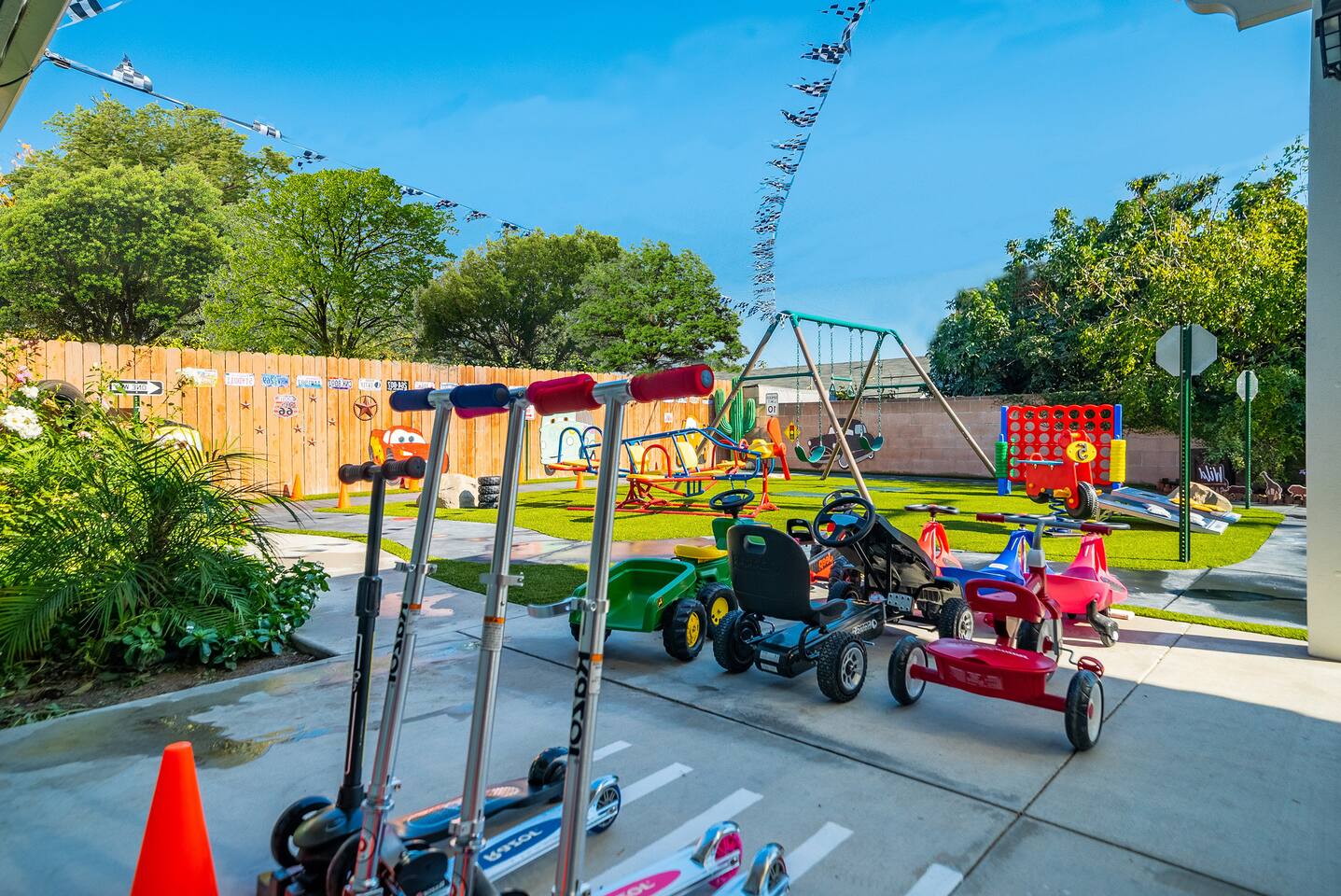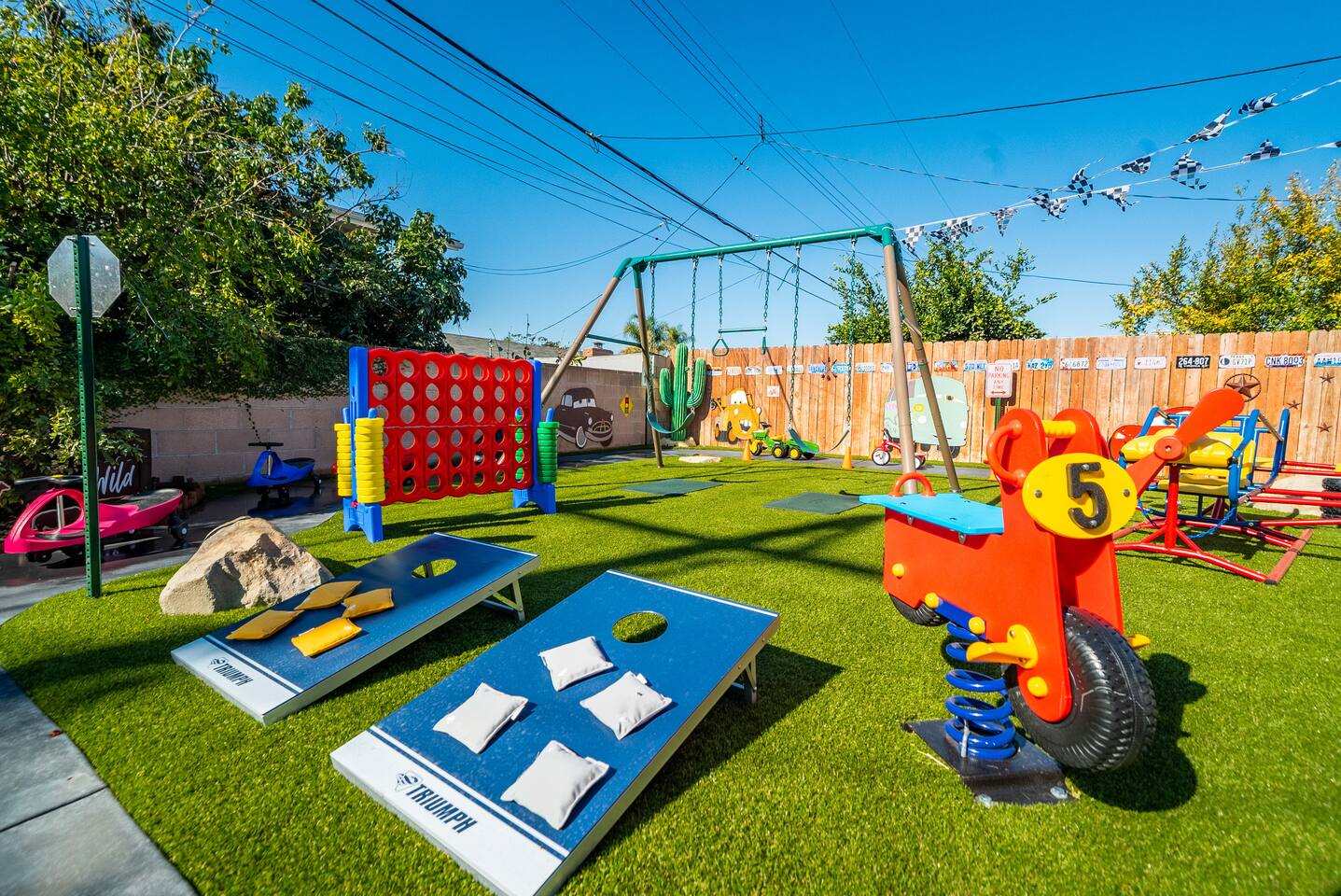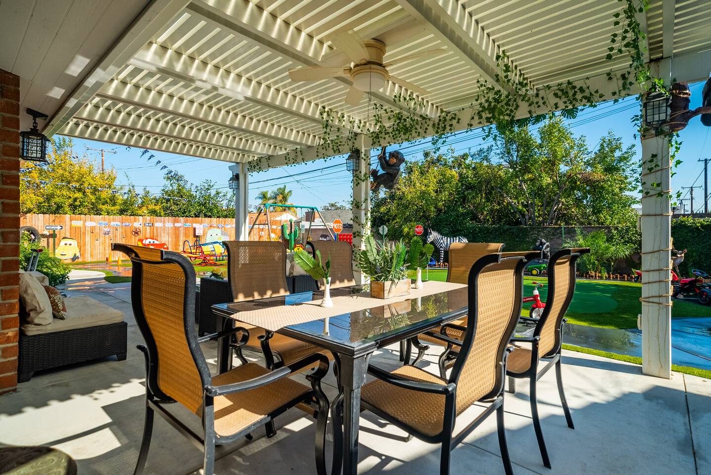 🌴 Welcome to the Ultimate Adventureland Escape! 🗺️✨ Step into a world of discovery, mystery, and tropical magic at this one-of-a-kind themed home—just minutes from Disneyland! 🏰 From Jungle Cruise vibes in the living room to Indiana Jones thrills and Enchanted Tiki Room charm in the bedrooms, this immersive 3BR, 2Bath retreat invites you on a journey through Adventureland—without ever leaving home. 🐒🌿 With a jungle-themed arcade, life-sized animal statues, mini-golf, and a brand-new ping pong table in the lush backyard, the fun never stops. And don’t miss the signature Adventure Scavenger Hunt! 🌺🔍 Follow clues hidden throughout the house and grounds to unlock surprises the whole family will love. ★ LIVING ROOM – JUNGLE CRUISE LOUNGE ★ 🛋️🌴 Anchors aweigh! Kick back and relax in your own Jungle Cruise-inspired hideaway. Whether you’re streaming a movie, sharing stories from the day, or enjoying the two luxurious massage chairs, this living room is designed for deep relaxation and lighthearted fun. ✔️ Plush L-Shaped Sofa with tropical throw pillows ✔️ 2 Zero-Gravity Massage Chairs 📺 Smart TV with Disney+, Netflix, Hulu, HBO & more 🎮 Xbox Console + Family Board Games 🌿 Adventureland Decor + Direct Backyard Access ★ KITCHEN & DINING – THE SKIPPER’S GALLEY ★ 🍽️🚤 Fuel your adventure in this fully stocked kitchen, equipped with modern appliances and everything you need to whip up family feasts or quick snacks. ✔️ Microwave, Stove, Oven, Fridge/Freezer ✔️ Coffee Maker, Hot Water Kettle, Toaster, Blender ✔️ Full Cookware, Dishware & Utensils ☕ Complimentary Coffee, Tea, Cereal & Snacks 🍴 Dining Table seats 6 + Bar seating for 4 ★ ADVENTURELAND SLEEPING QUARTERS – 3 THEMED BEDROOMS ★ 🛏️🌺 🛏️ Indiana Jones Master Suite ✔️ King-Size Bed ✔️ Private Ensuite Bathroom ✔️ 4K Smart TV ✔️ Explorer-Inspired Decor & Storage 🛏️ Tiki Room Tranquility ✔️ King-Size Bed ✔️ Enchanted Tiki Room Art & Accessories ✔️ Spacious Closet & Dresser ✔️ 4K Smart TV 🛏️ Jungle Bunk House ✔️ 1 Triple Bunk Bed (Twin/Twin/Queen) ✔️ 1 Double Bunk Bed (Twin/Twin w/ Trundle) ✔️ Designed for kids or adventurous adults ✔️ Tropical Wall Murals & Jungle Decor ✔️ 4K Smart TV 🛌 Premium Sheets, Pillows & Nightstands throughout ★ BATHROOMS – WASH UP IN EXPLORER STYLE ★ 🚿🧴 Freshen up in two beautifully appointed bathrooms, complete with thoughtful touches to help you recharge before your next expedition. ✔️ Master Ensuite: Walk-In Shower + Double Vanity ✔️ Shared Bath: Bathtub/Shower Combo ✔️ Hair Dryers, Towels & Toiletries Provided ★ GAME ROOM – JUNGLE ARCADE ★ 🎮🦧 Escape into the jungle-themed arcade, decked out with hanging vines, neon lighting, and all the classics—all set to FREE PLAY! ✔️ Multiple Classic Arcade Machines ✔️ Jungle Decor & Gaming Vibes Galore ★ BACKYARD – YOUR PRIVATE ADVENTURE PARK ★ 🌳🏌️♀️ This lush outdoor space is part safari, part mini theme park! Play a round of mini-golf, challenge your group to ping pong, or cruise through the jungle on scooters along the safari. ✔️ Mini-Golf Course ✔️ Ping Pong Table ✔️ Life-Sized Animal Statues ✔️ Playground & Lawn Games ✔️ Jungle Jeep Kids Ride 🔥 BBQ Grill + Outdoor Dining for 6 ★ ADVENTURELAND SCAVENGER HUNT ★ 📜✨ Discover hidden clues, solve puzzles, and unlock surprises in this fully interactive scavenger hunt experience designed for all ages. A guest favorite—and a memory-maker! This isn't just a home—it’s a one-of-a-kind Adventureland escape, crafted for memory-making, laughter, and storytelling. Whether you’re a family of explorers, a group of friends, or Disney-loving adventurers, you’ll find magic around every corner. 🌺🐘