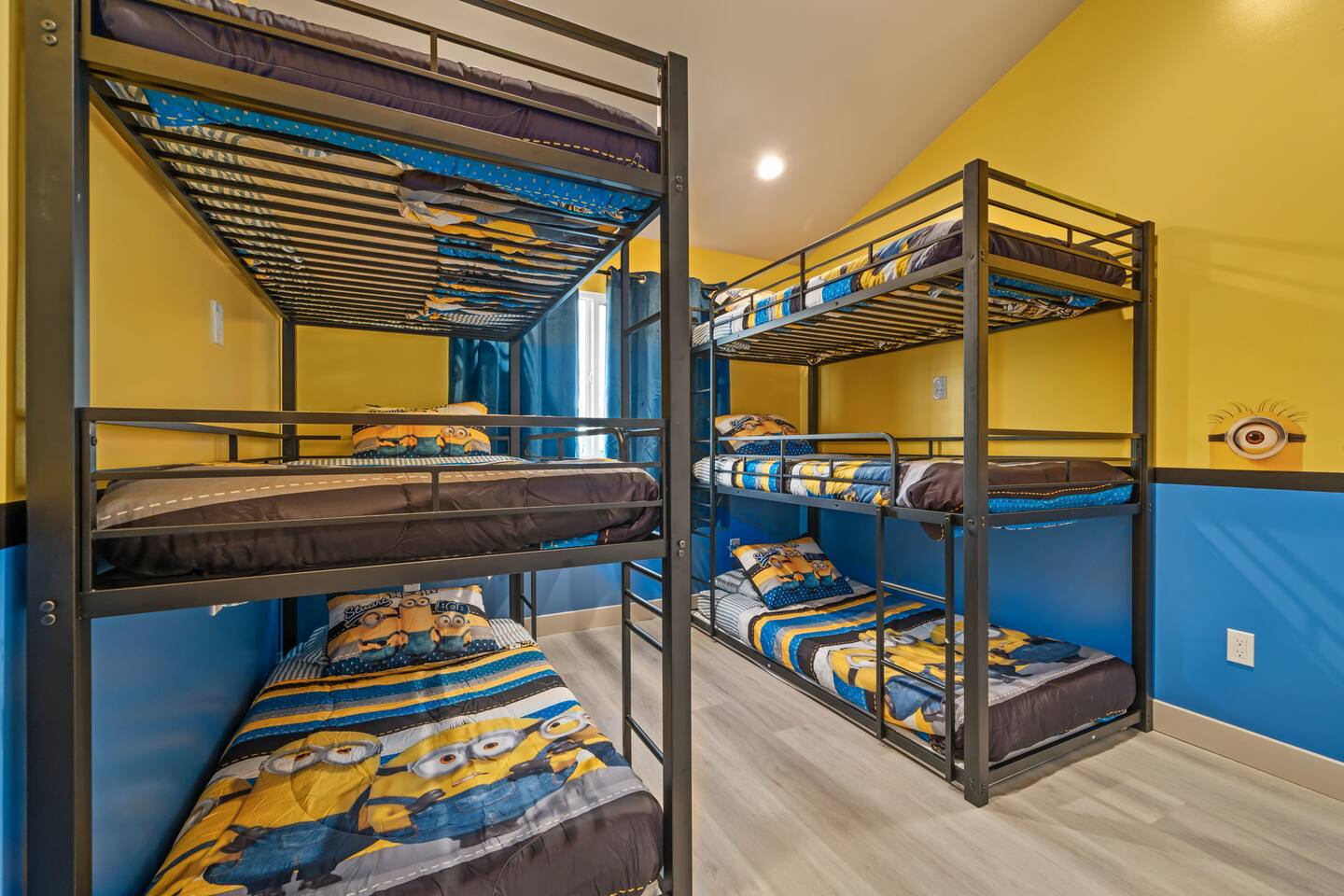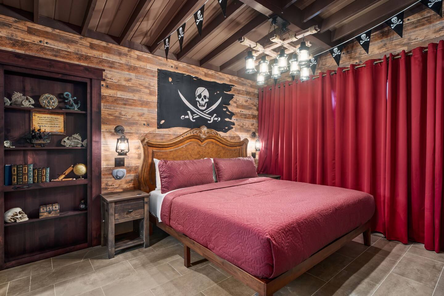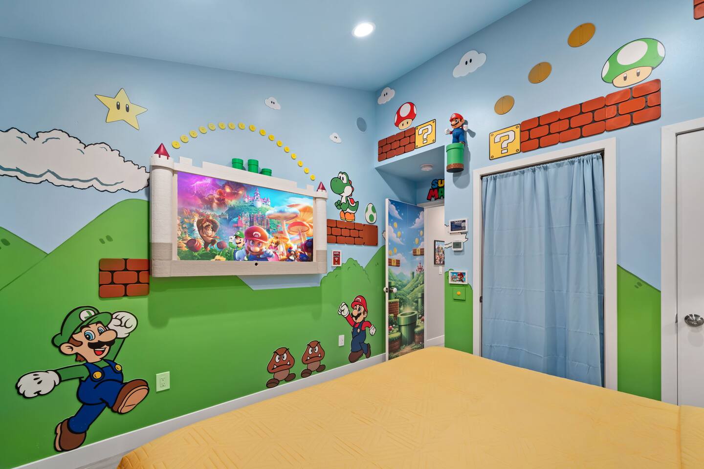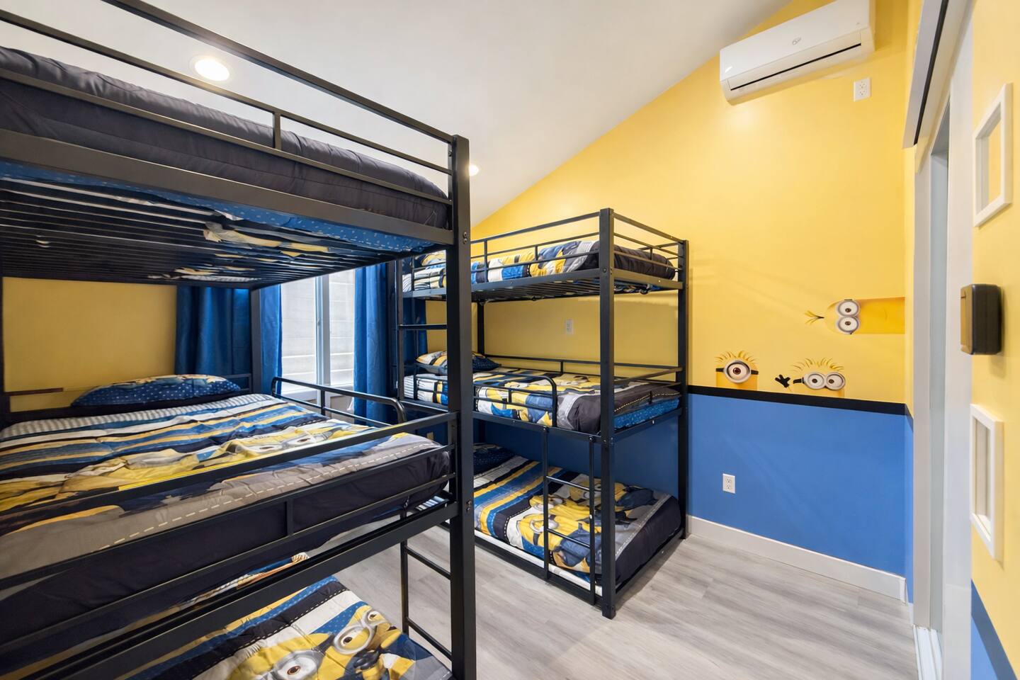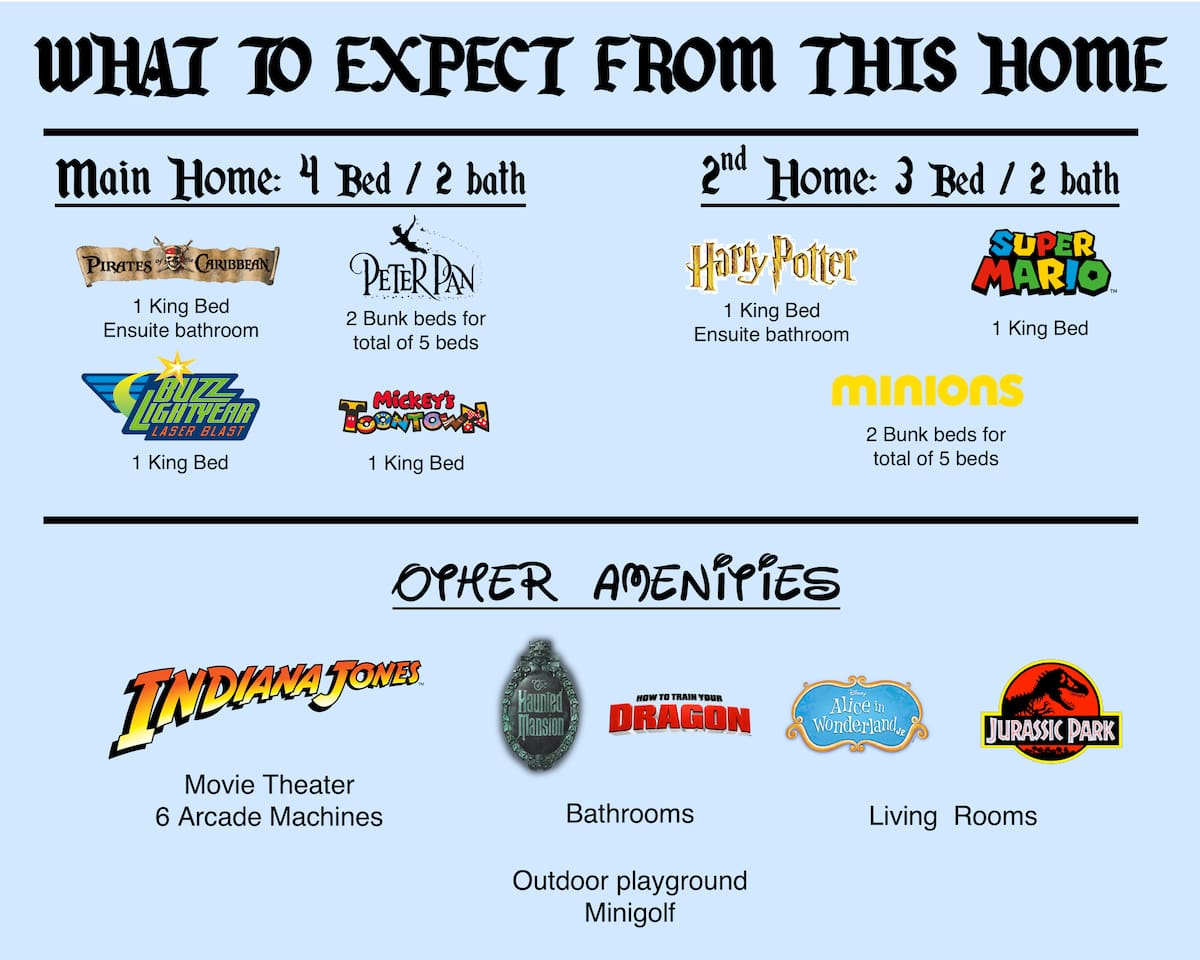🎬✨ Welcome to the Ultimate Theme-Park Compound ✨🎬 Brought to you by OC Adventure Homes This one-of-a-kind retreat features two fully themed homes on one lot, designed to feel like your own private theme park. The front home brings classic Disney-inspired magic, while the second home delivers Universal-inspired adventure—all connected by a shared outdoor playland built for nonstop fun. Perfect for large families, multi-family trips, and group getaways, this is more than a place to stay—it’s an experience kids (and adults) will be talking about long after checkout. ⚠️ Please note: the maximum occupancy is 18 guests total, including all adults and children. 🏰 MAIN HOME – DISNEY-INSPIRED MAGIC Every room in the main house tells a story, blending nostalgia, imagination, and hidden surprises. 🦜 Pirates of the Caribbean Master Suite Step into a candle-lit pirate hideaway where adventure lurks behind every detail. Weathered textures, nautical accents, and dramatic lighting set the mood for a high-seas escape. ✔️ King Bed ✔️ Smart TV ✔️ Private ensuite bathroom ✔️ Secret bookcase entrance leading directly into the movie theater ✨ Peter Pan Kids’ Room A whimsical Neverland adventure where kids can fly off to dreamland. Designed for play, laughter, and late-night storytelling. ✔️ One Triple Bunk + One Double Bunk ✔️ 5 Total Beds ✔️ Smart TV ✔️ Bright, imaginative décor perfect for younger guests 🚀 Buzz Lightyear Space Bedroom Blast off into a sleek, space-inspired retreat filled with cosmic energy and futuristic touches. ✔️ Queen Bed ✔️ Smart TV ✔️ Clean, bold sci-fi theming 🏘️ Mickey’s Toontown Bedroom A playful, colorful space inspired by classic cartoon charm—bright, cheerful, and full of personality. ✔️ King Bed ✔️ Smart TV ✔️ Fun, animated design details 🎬 Indiana Jones Movie Theater & Free-Play Arcade Adventure takes center stage in this action-packed entertainment zone. 🗺️ Temple-inspired décor 🎥 Large-screen movie theater 🕹️ Free-to-play arcade machines 🍿 The perfect space for movie nights, rainy days, and epic family competitions ♠️ Alice in Wonderland Living Room & Kitchen Nothing is quite what it seems in this imaginative gathering space. This whimsical living room and kitchen combo is the heart of the home, designed for gathering, relaxing, and making memories together. 🛋️ Seating for 8 📺 Smart TV 🎮 Xbox One with free Xbox Game Pass Unlimited 🍽️ Kitchen stocked with cooking essentials 🥣 Cereal and snacks available for guests 🎲 Board games and family hangout vibes 🚿 Themed Bathrooms 🕯️ Haunted Mansion Bathroom – moody, mysterious, and atmospheric 🦜 Pirates of the Caribbean Bathroom – the private ensuite attached to the master suite, continuing the immersive pirate theming 🎥 SECOND HOME – UNIVERSAL-INSPIRED ADVENTURE Tucked behind the main house, the second home delivers blockbuster excitement with its own immersive worlds. ⚡ Harry Potter Master Suite A magical retreat filled with spellbinding details—perfect for witches, wizards, and fans of fantasy. ✔️ King Bed ✔️ Smart TV ✔️ Private Ensuite Bathroom 🍄 Super Mario Bedroom Bright, bold, and playful—this room feels like stepping into a video game world. ✔️ King Bed ✔️ Smart TV ✔️ Colorful, game-inspired design 🎭 Minions Kids’ Room A high-energy space bursting with fun, mischief, and laughter. ✔️ Two Triple Bunk Beds ✔️ 6 Total Twin Beds ✔️ Smart TV ✔️ Designed for kids to play hard, laugh loud, and sleep well 🦖 Jurassic Park Living Room & Kitchen A cinematic jungle escape with adventurous flair—perfect for relaxing between expeditions. This themed living room and kitchen combo has everything you need for a cozy stay in the second home. 🛋️ Comfortable seating 📺 Smart TV 🦕 Immersive dinosaur-inspired décor 🍽️ Dining for 4 🍳 Cooking essentials provided 🥣 Cereal and snacks available for guests 🚿 How to Train Your Dragon Bathroom Fantasy-inspired details bring this imaginative world to life in unexpected ways. 🌴 SHARED OUTDOOR PLAYLAND Both homes open to a shared backyard designed for kids to run, play, and explore while adults relax nearby. ⛳ Mini-golf 🎠 Kiddie rides, including a carousel 🏓 Ping pong 🏊 Pool with 4-foot depth throughout 🔒 Pool is gated on all sides for added child safety 🍽️ Outdoor dining area 🎯 Open play space and backyard fun for all ages 🏆 INTERACTIVE TREASURE HUNT EXPERIENCE This home also includes a themed treasure hunt competition where your group can choose Team Disney or Team Universal and face off to see which side comes out on top. Only one team can win — so choose wisely and get ready for some friendly competition. ✨ WHY GUESTS LOVE THIS HOME ✔️ Two homes = more space + more privacy ✔️ Every bedroom has a Smart TV ✔️ Free-to-play arcade games ✔️ Indoor + outdoor entertainment ✔️ Immersive theming throughout both homes ✔️ Treasure hunt competition built into the experience ✔️ Great for large families, reunions, and group trips