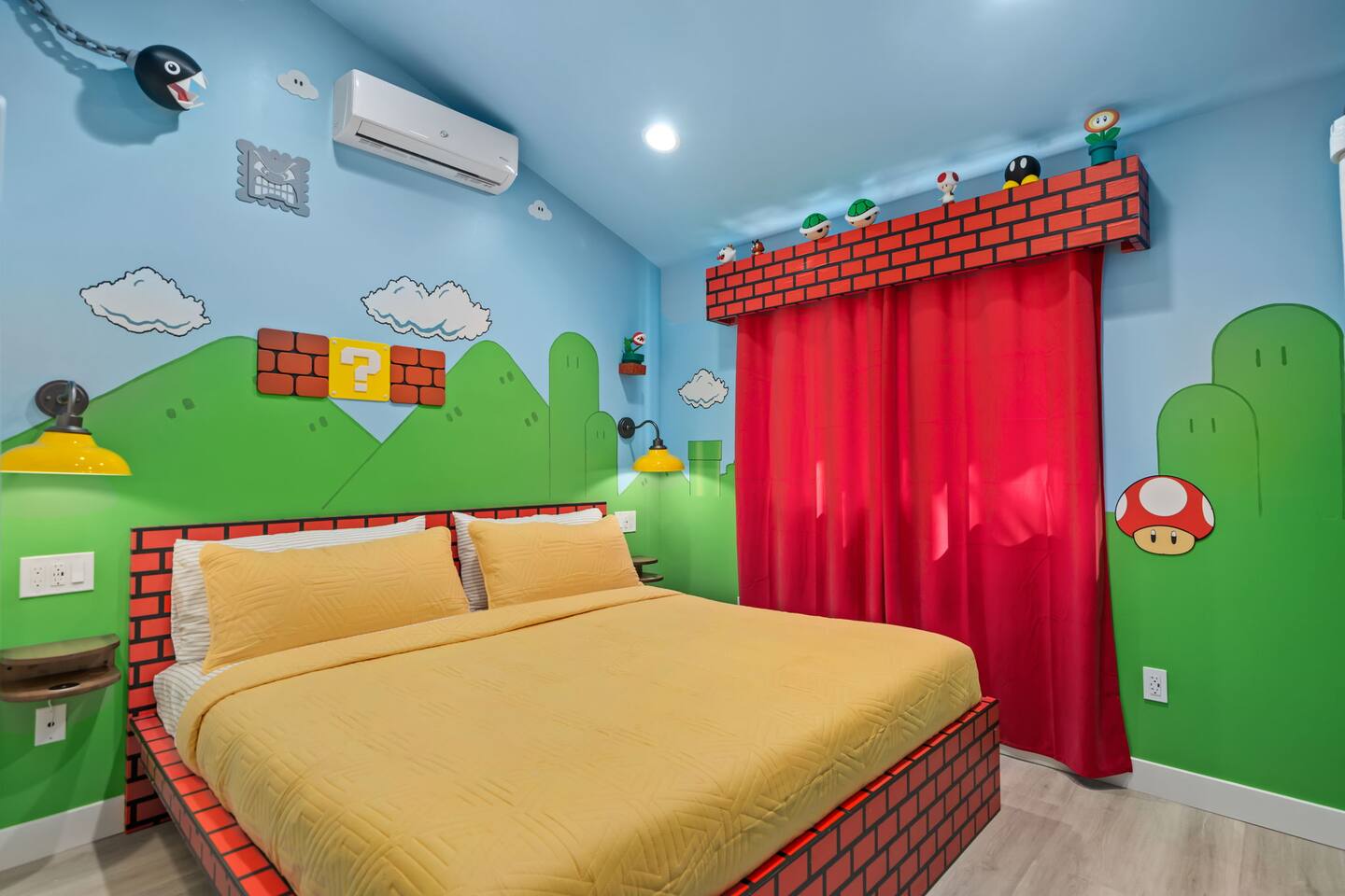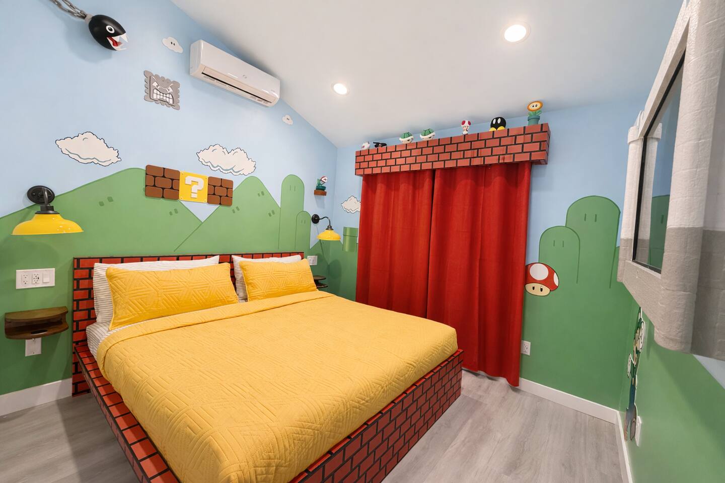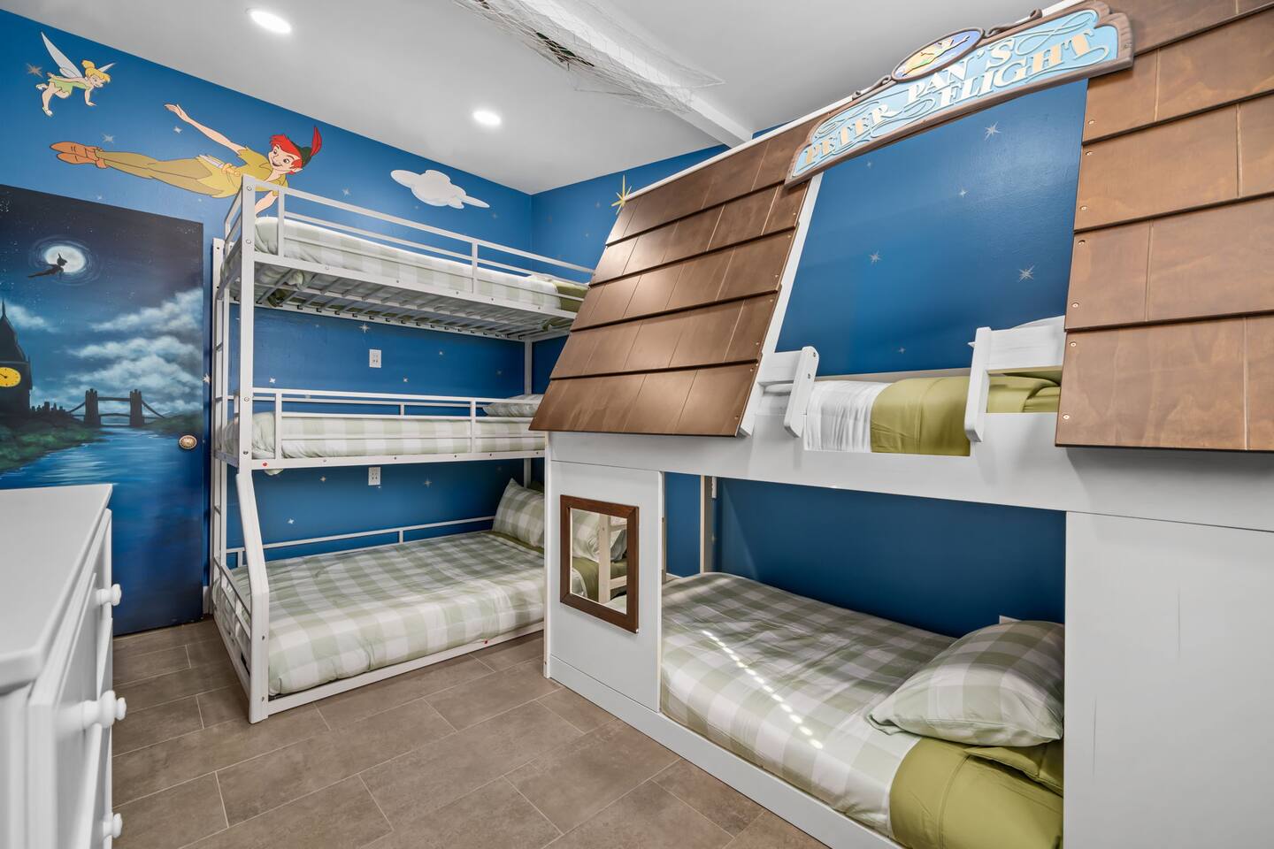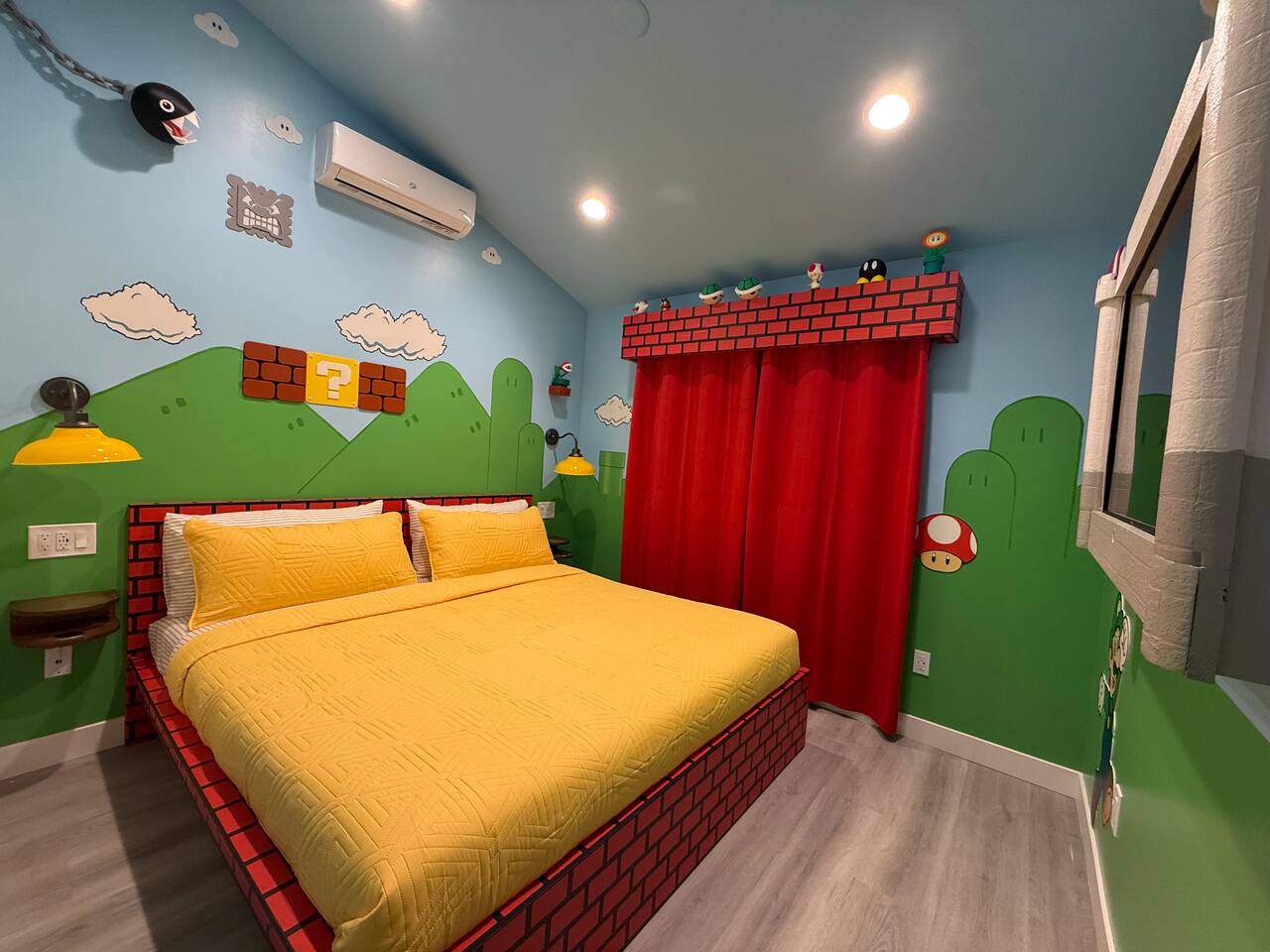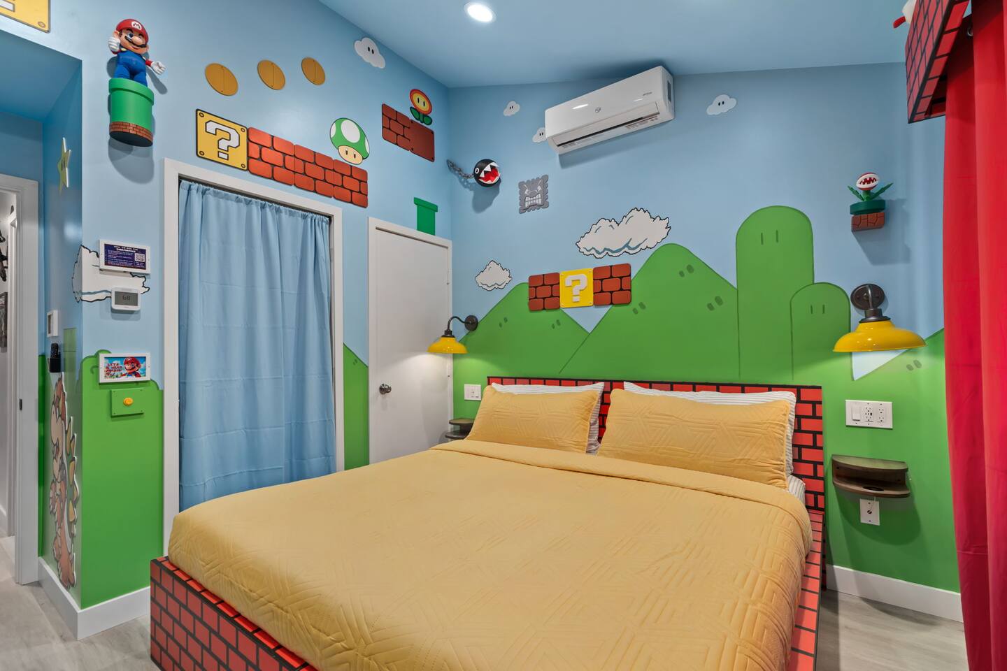 🎬✨ Welcome to the Ultimate Theme-Park Compound ✨🎬 Brought to you by OC Adventure Homes This one-of-a-kind retreat features two fully themed homes on one lot, designed to feel like your own private theme park. The front home brings classic Disney-inspired magic, while the second home delivers Universal-inspired adventure—all connected by a shared outdoor playland built for nonstop fun. Perfect for large families, multi-family trips, and group getaways, this is more than a place to stay—it’s an experience kids (and adults) will be talking about long after checkout. ⚠️ Please note: the maximum occupancy is 18 guests total, including all adults and children. 🏰 MAIN HOME – DISNEY-INSPIRED MAGIC Every room in the main house tells a story, blending nostalgia, imagination, and hidden surprises. 🦜 Pirates of the Caribbean Master Suite Step into a candle-lit pirate hideaway where adventure lurks behind every detail. Weathered textures, nautical accents, and dramatic lighting set the mood for a high-seas escape. ✔️ King Bed ✔️ Smart TV ✔️ Private ensuite bathroom ✔️ Secret bookcase entrance leading directly into the movie theater ✨ Peter Pan Kids’ Room A whimsical Neverland adventure where kids can fly off to dreamland. Designed for play, laughter, and late-night storytelling. ✔️ One Triple Bunk + One Double Bunk ✔️ 5 Total Beds ✔️ Smart TV ✔️ Bright, imaginative décor perfect for younger guests 🚀 Buzz Lightyear Space Bedroom Blast off into a sleek, space-inspired retreat filled with cosmic energy and futuristic touches. ✔️ Queen Bed ✔️ Smart TV ✔️ Clean, bold sci-fi theming 🏘️ Mickey’s Toontown Bedroom A playful, colorful space inspired by classic cartoon charm—bright, cheerful, and full of personality. ✔️ King Bed ✔️ Smart TV ✔️ Fun, animated design details 🎬 Indiana Jones Movie Theater & Free-Play Arcade Adventure takes center stage in this action-packed entertainment zone. 🗺️ Temple-inspired décor 🎥 Large-screen movie theater 🕹️ Free-to-play arcade machines 🍿 The perfect space for movie nights, rainy days, and epic family competitions ♠️ Alice in Wonderland Living Room & Kitchen Nothing is quite what it seems in this imaginative gathering space. This whimsical living room and kitchen combo is the heart of the home, designed for gathering, relaxing, and making memories together. 🛋️ Seating for 8 📺 Smart TV 🎮 Xbox One with free Xbox Game Pass Unlimited 🍽️ Kitchen stocked with cooking essentials 🥣 Cereal and snacks available for guests 🎲 Board games and family hangout vibes 🚿 Themed Bathrooms 🕯️ Haunted Mansion Bathroom – moody, mysterious, and atmospheric 🦜 Pirates of the Caribbean Bathroom – the private ensuite attached to the master suite, continuing the immersive pirate theming 🎥 SECOND HOME – UNIVERSAL-INSPIRED ADVENTURE Tucked behind the main house, the second home delivers blockbuster excitement with its own immersive worlds. ⚡ Harry Potter Master Suite A magical retreat filled with spellbinding details—perfect for witches, wizards, and fans of fantasy. ✔️ King Bed ✔️ Smart TV ✔️ Private Ensuite Bathroom 🍄 Super Mario Bedroom Bright, bold, and playful—this room feels like stepping into a video game world. ✔️ King Bed ✔️ Smart TV ✔️ Colorful, game-inspired design 🎭 Minions Kids’ Room A high-energy space bursting with fun, mischief, and laughter. ✔️ Two Triple Bunk Beds ✔️ 6 Total Twin Beds ✔️ Smart TV ✔️ Designed for kids to play hard, laugh loud, and sleep well 🦖 Jurassic Park Living Room & Kitchen A cinematic jungle escape with adventurous flair—perfect for relaxing between expeditions. This themed living room and kitchen combo has everything you need for a cozy stay in the second home. 🛋️ Comfortable seating 📺 Smart TV 🦕 Immersive dinosaur-inspired décor 🍽️ Dining for 4 🍳 Cooking essentials provided 🥣 Cereal and snacks available for guests 🚿 How to Train Your Dragon Bathroom Fantasy-inspired details bring this imaginative world to life in unexpected ways. 🌴 SHARED OUTDOOR PLAYLAND Both homes open to a shared backyard designed for kids to run, play, and explore while adults relax nearby. ⛳ Mini-golf 🎠 Kiddie rides, including a carousel 🏓 Ping pong 🏊 Pool with 4-foot depth throughout 🔒 Pool is gated on all sides for added child safety 🍽️ Outdoor dining area 🎯 Open play space and backyard fun for all ages 🏆 INTERACTIVE TREASURE HUNT EXPERIENCE This home also includes a themed treasure hunt competition where your group can choose Team Disney or Team Universal and face off to see which side comes out on top. Only one team can win — so choose wisely and get ready for some friendly competition. ✨ WHY GUESTS LOVE THIS HOME ✔️ Two homes = more space + more privacy ✔️ Every bedroom has a Smart TV ✔️ Free-to-play arcade games ✔️ Indoor + outdoor entertainment ✔️ Immersive theming throughout both homes ✔️ Treasure hunt competition built into the experience ✔️ Great for large families, reunions, and group trips