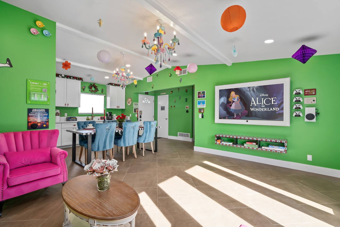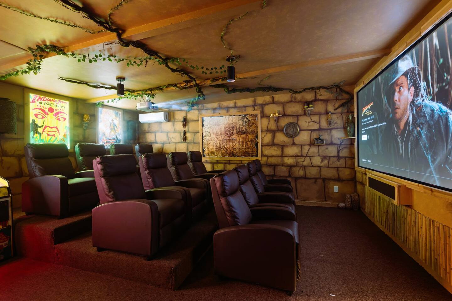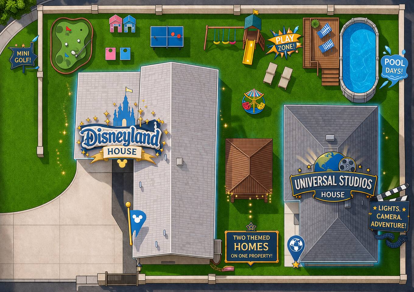 🎢 Welcome to the Ultimate Theme Park Retreat! ✨ Enjoy 2 themed homes on 1 lot—one Disney-inspired and one Universal-inspired—filled with immersive rooms, secret passages, and nonstop fun for the whole family. Highlights: 🛏️ 7 themed bedrooms 🎬 Indiana Jones theater + free-play arcade 🌴 Large yard with gated pool, mini-golf, ping pong, kiddie rides & carousel 🏆 Disney vs. Universal treasure hunt challenge Max occupancy: 18 guests total, including kids and adults.